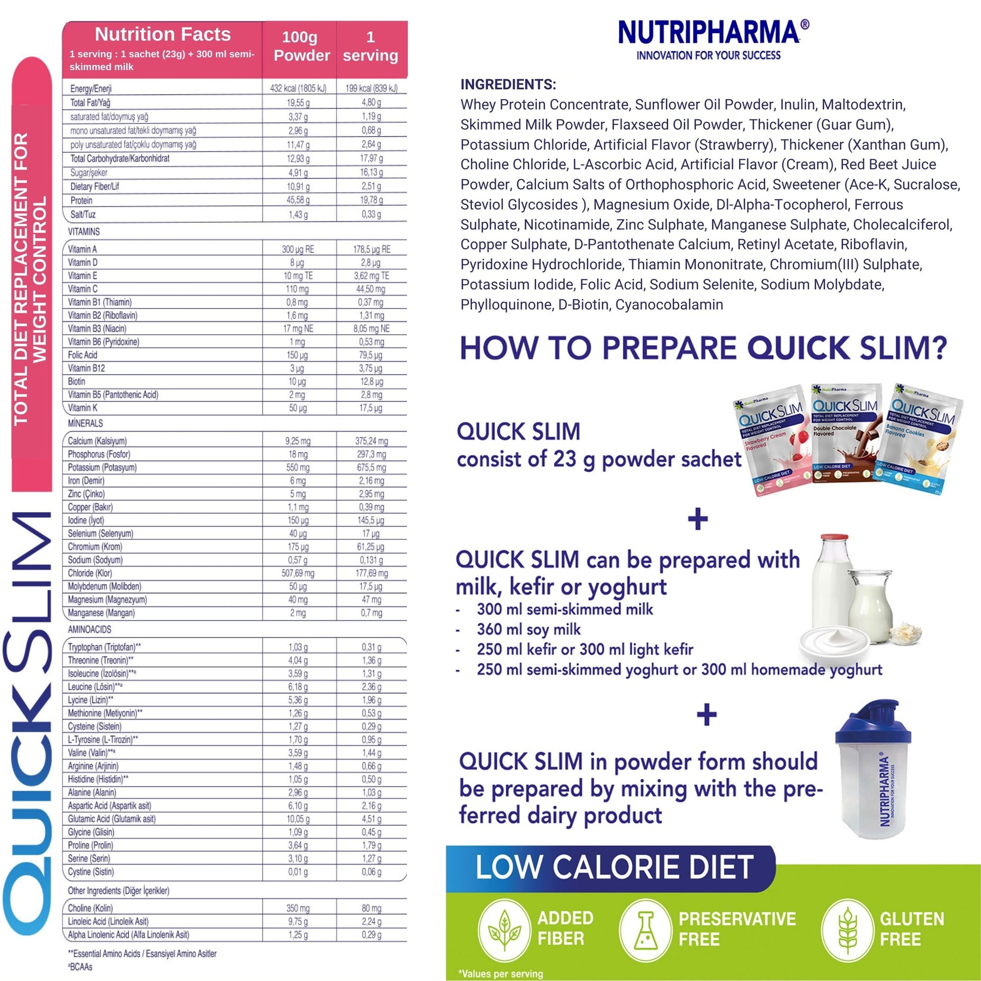 Der QUICK SLIM-Shake zur Gewichtsabnahme enthält 20 g Protein, 13 Aminosäuren, 27 Vitamine und Mineralien, Löwenzahn-Ballaststoffe (Präbiotikum) und Cholin pro Portion.