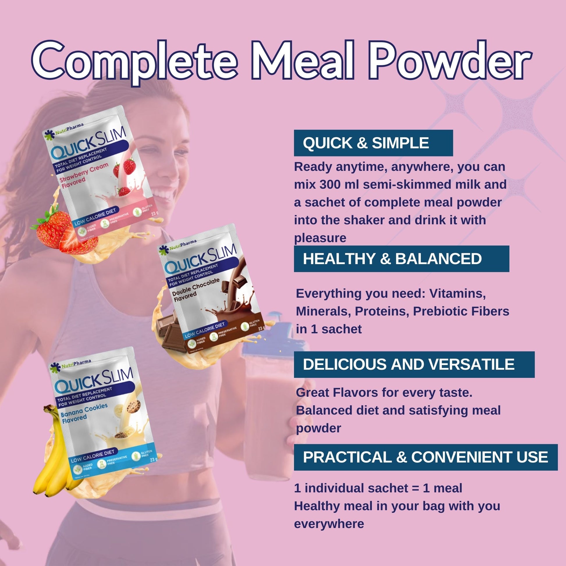 EINFACH ZUZUBEREITEN: Quick Slim-Shakes zum Abnehmen Alle Ihre Lieblingsgeschmacksrichtungen von Quick Slim Shake (Doppelschokolade, Erdbeercreme und Bananenkekse) in einem Portionsbeutel. Perfekt für unterwegs. Einzelportionsbeutel machen es praktisch zum Mitnehmen auf Reisen, ins Büro oder ins Fitnessstudio. Stecken Sie einen in Ihre Tasche und genießen Sie Ihren Shake bei der Arbeit oder unterwegs. Einfach Magermilch hinzufügen, schütteln und genießen!