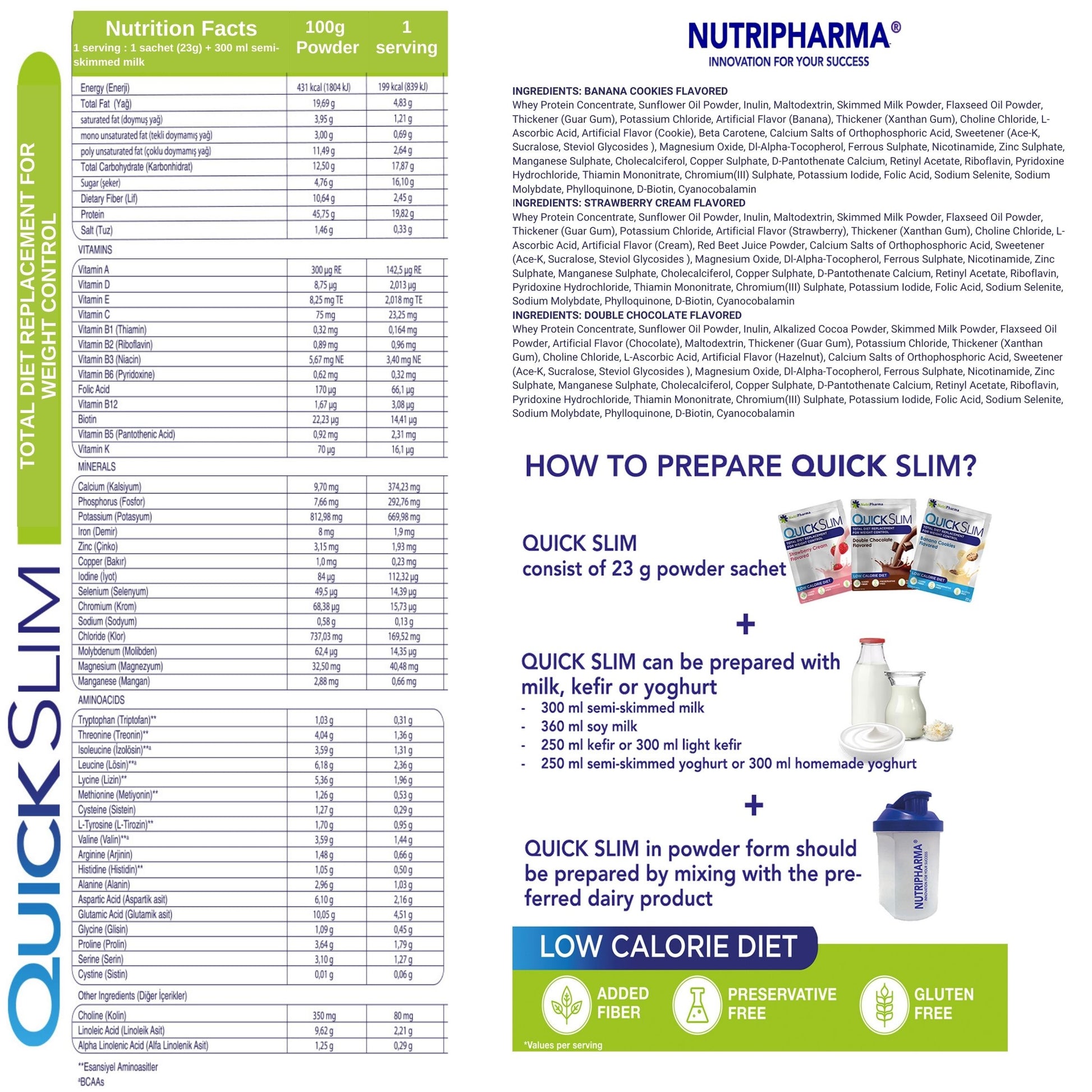 Der QUICK SLIM-Shake zur Gewichtsabnahme enthält 20 g Protein, 13 Aminosäuren, 27 Vitamine und Mineralien, Löwenzahn-Ballaststoffe (Präbiotikum) und Cholin pro Portion.